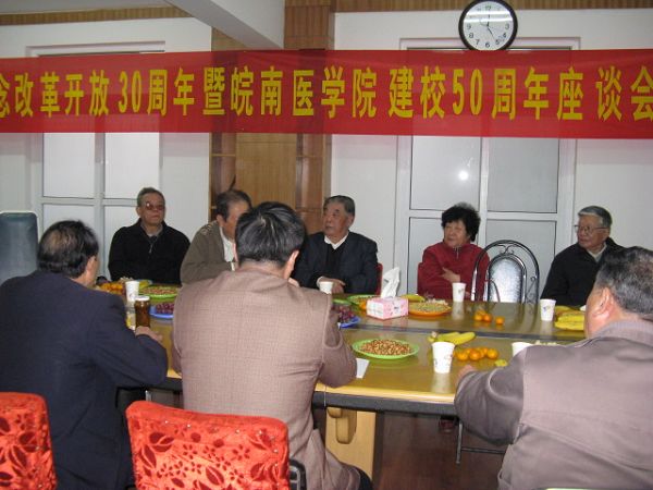 老同志曾经为我校建设事业作出过重大贡献,为学校的全面发展立下了汗马功劳。他们是学校改革与发展的见证者、实践者、推动者。在近四个小时的座谈会上,老同志们从各个角度盛赞了改革开放政策,回顾了50年来艰难的办学历程,提出了推动学校发展的真知灼见。郑培敏同志从思想解放和理论创新的角度谈了改革开放30年来的变化,他说,国家要发展,学校要做大,就必须解放思想、实事求是,以中国特色社会主义理论为指导,不断与时俱进。曲光峰同志回顾了办学初学校情况,他说,昔日的皖医与今天的皖医有着天壤之别,无论是校园面积、学科类别,还是学生人数都有了飞跃式的发展,建校以来,学校发生了专升本和建设新校区两次飞跃,这两次飞跃都得益于国家的进步和社会的发展。黄金余同志指出,30年来,国家进行了两次点火,一次是十一届三中全会,一次是十七届三中全会。我校也进行了两次点火,一次是建立芜湖医专,一次是建立新校区。他畅谈了观看奥运火炬传递的感受,赞扬了国家的惠农政策与措施。毛芳汉同志在作今昔对比时一再感叹:改革开放以来发生的巨大变化真是做梦也没有想到的。他高度肯定了学校的教学改革。吴国流同志谈了50年同学聚会时的感想,他为学校的发展感到欣慰和骄傲,他还高度赞扬了党中央的执政理念和治国方针。靳宽华同志从衣食住行等方面谈了30年来发生的巨大变化,并从国家解决粮食危机、应对当前金融危机和加强党的建设的角度高度肯定了中央的英明决策和执政水平。曹士珍同志以台湾与大陆两岸关系为例,感叹国家经济实力的日益强大。他说,邓小平关于市场经济的理论,为国家作出了巨大贡献,在世界也产生深远影响。吕灿群同志谈了在教学评建督导组工作期间的感触,高度肯定了广大教职医护员工在教学评建期间作出的努力。万立宏同志回顾了建立芜湖医专的过程,肯定了我校的办学质量,并对专业建设提出了具体意见。吴永华同志的一生中有50多年是在学校度过的,因而感触很深,他从实验教学的角度回顾了办学的艰辛,高度赞扬了办学以来学校的快速发展。老同志们指出,学校当前的发展与成就有目共睹,学校在教学评估和新校区建设中取得的成绩令人振奋,但离教育部本科教学工作的要求还有一定差距,学校的发展任重道远。他们相信,在校党委的正确领导下,在广大教职医护员工的努力下,学校一定会实现新的飞跃。
