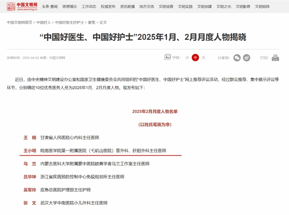 近日,由中央文明办和国家卫生健康委共同组织的“中国好医生、中国好护士”网上推荐评议活动,经过群众推荐、集中展示评议等环节,确定10位优秀医务人员为2025年2月月度人物,我校第一附属医院肝胆外科王小明光荣上榜。