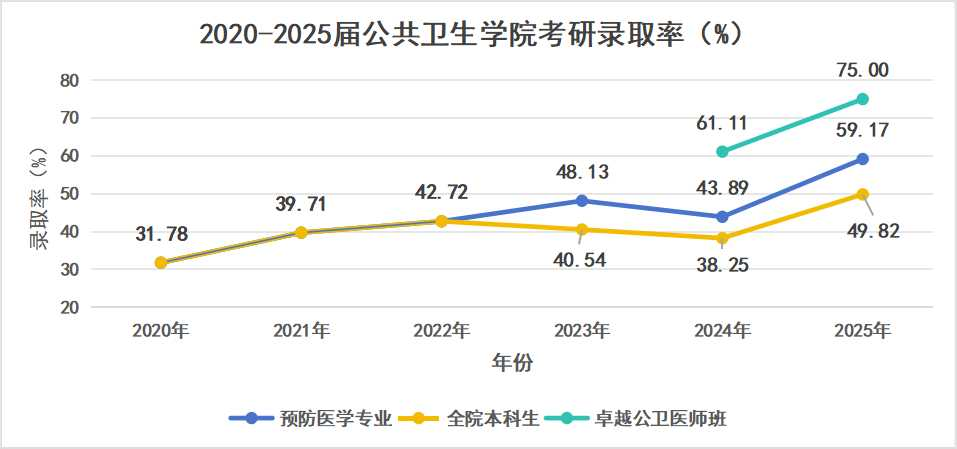 学院强化人才培养质量,2024年公共卫生执业医师考试总通过率为70.41%,高于全国平均水平和211高校水平,与985高校基本持平。学院近5年本科专业考研录取率整体呈上升趋势。