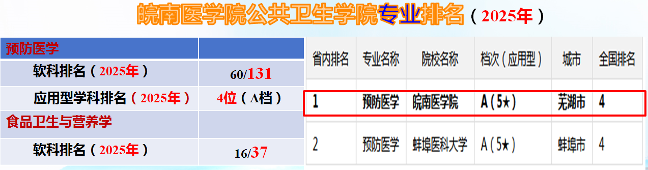 学院现有本科和研究生2个办学层次,拥有3个本科专业(预防医学[含专升本]、食品卫生与营养学、生物统计学),其中预防医学专业为省级“特色专业”、安徽省一流专业建设点。拥有公共卫生与预防医学一级学科硕士学位授予点、公共卫生专业硕士学位授予类别(MPH),其中公共卫生与预防医学学科为省级应用型高峰培育学科、校级一流学科。获批安徽省高水平公共卫生学院、高校公共卫生危机管理安徽省哲学社会科学重点实验室、省级公共卫生与预防医学教学团队、省级高校产学研联合培养研究生示范基地等。