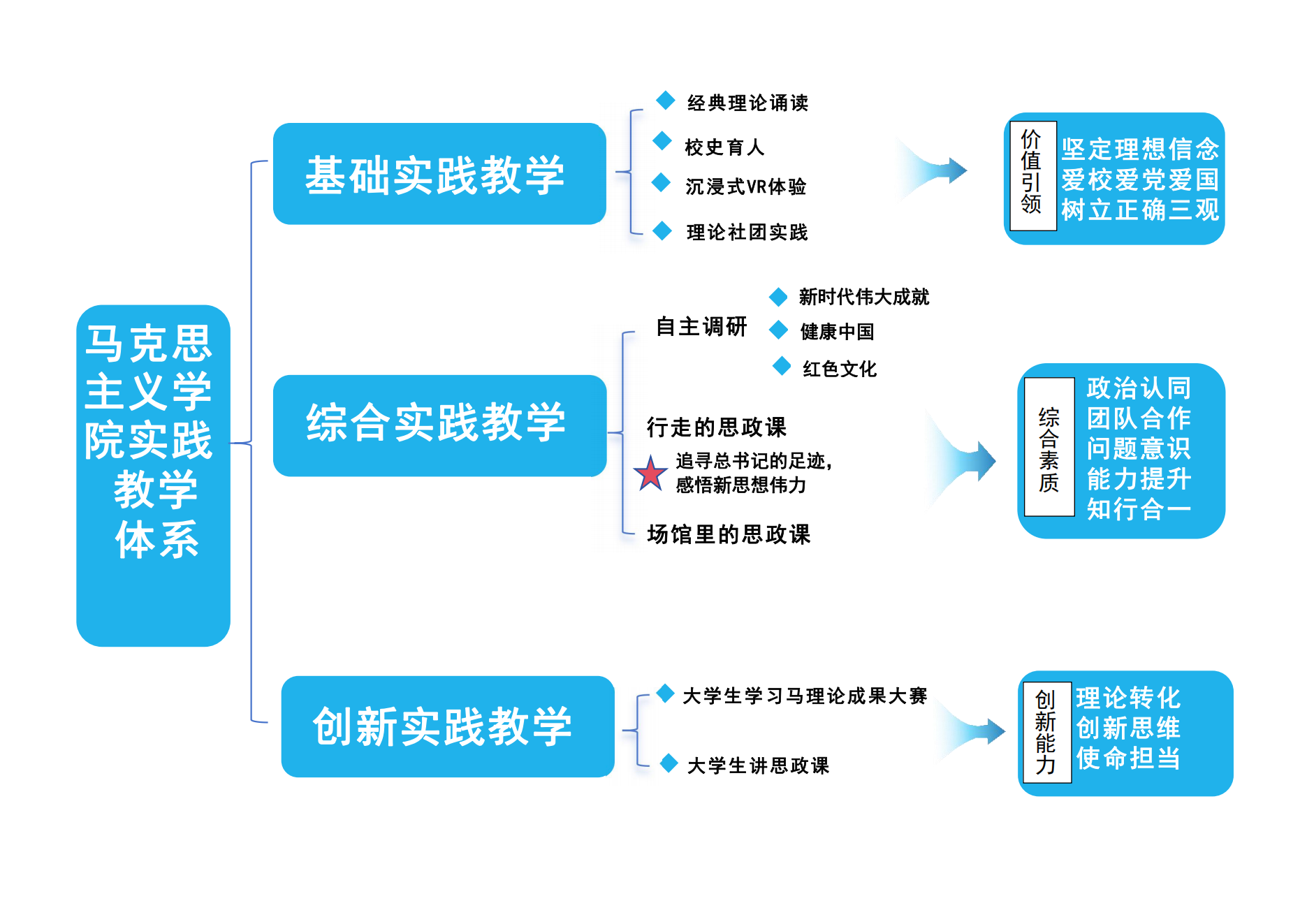 通过全员化参与、课程化改革、项目化管理、精品化推进、制度化保障、社会化运作,推进实践教学改革创新,围绕“实践+”思政育人维度,探索“3+1”“沉浸式”体验实践教学模式。聚焦“青春思政课”“艺术思政课”“国旗下的思政课”三个校内实践形式和“行走的思政课”校外实践形式,全面提升学生思想政治理论素养,实现知、情、信、意、行的统一,达成育人目标。