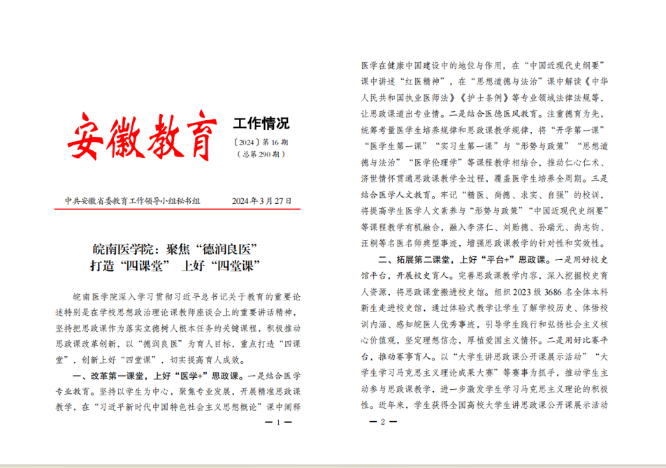 二是育人模式更趋完善。立足医学特色,构建“德润良医”育人品牌,打造“四课堂”融通机制。相关典型经验被《光明日报》《安徽教育》等主流媒体、政府内参报道和收录。深化课程思政改革,《大思政视域下医学院校“五纬并进”课程思政育人模式实践探索》等思政育人模式获批安徽省教学成果奖特等奖和一、二、三等奖各1项。