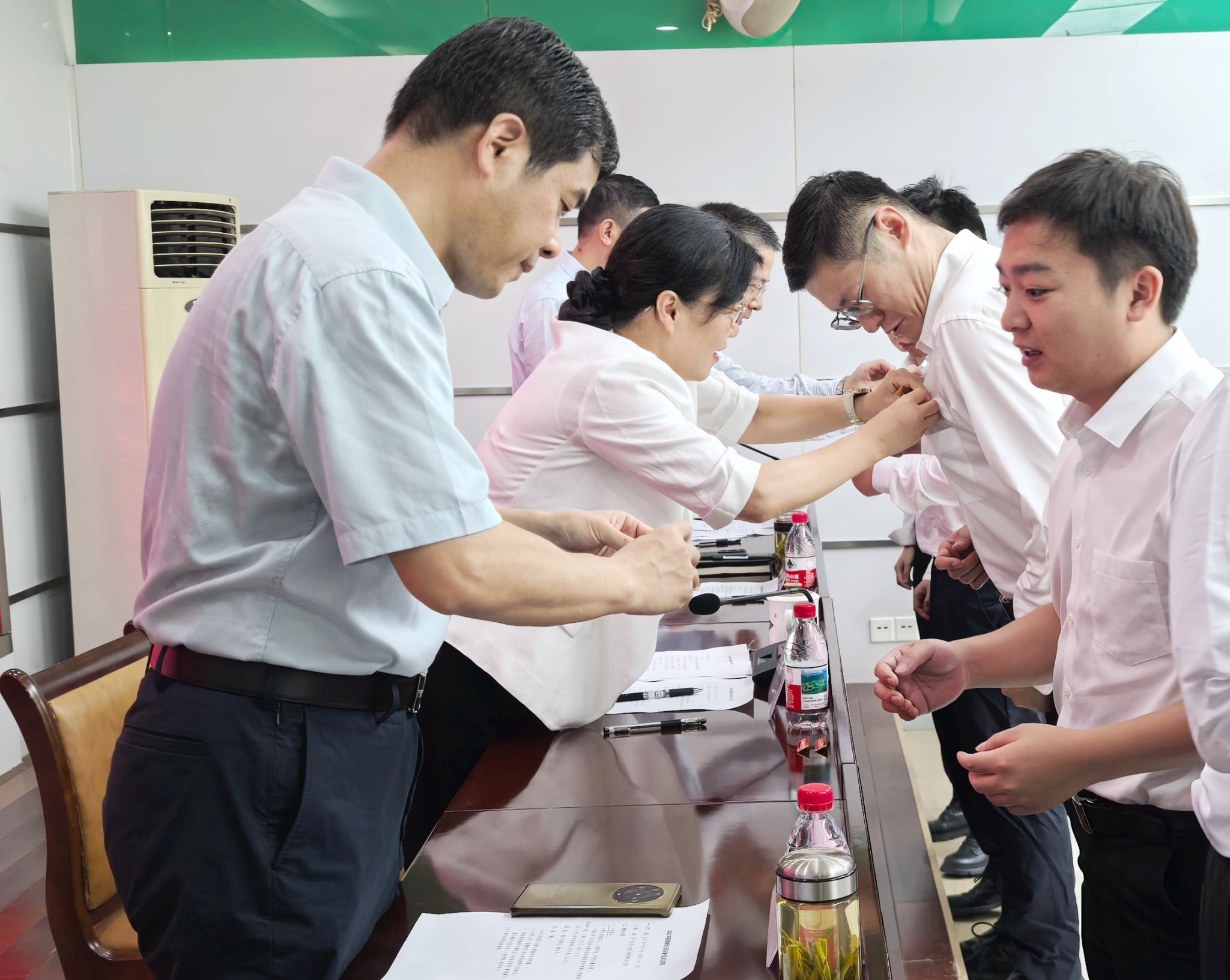 会上,与会校领导分别为新教师颁授并佩戴校徽。